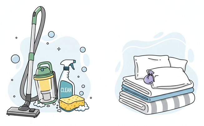 • In the living room: Arrange it as it was upon your arrival. Clean the table thoroughly. Remove any crumbs from the sofa or beds. Replace the bedspreads and place the folded duvets on the beds with the pillows on the beds.