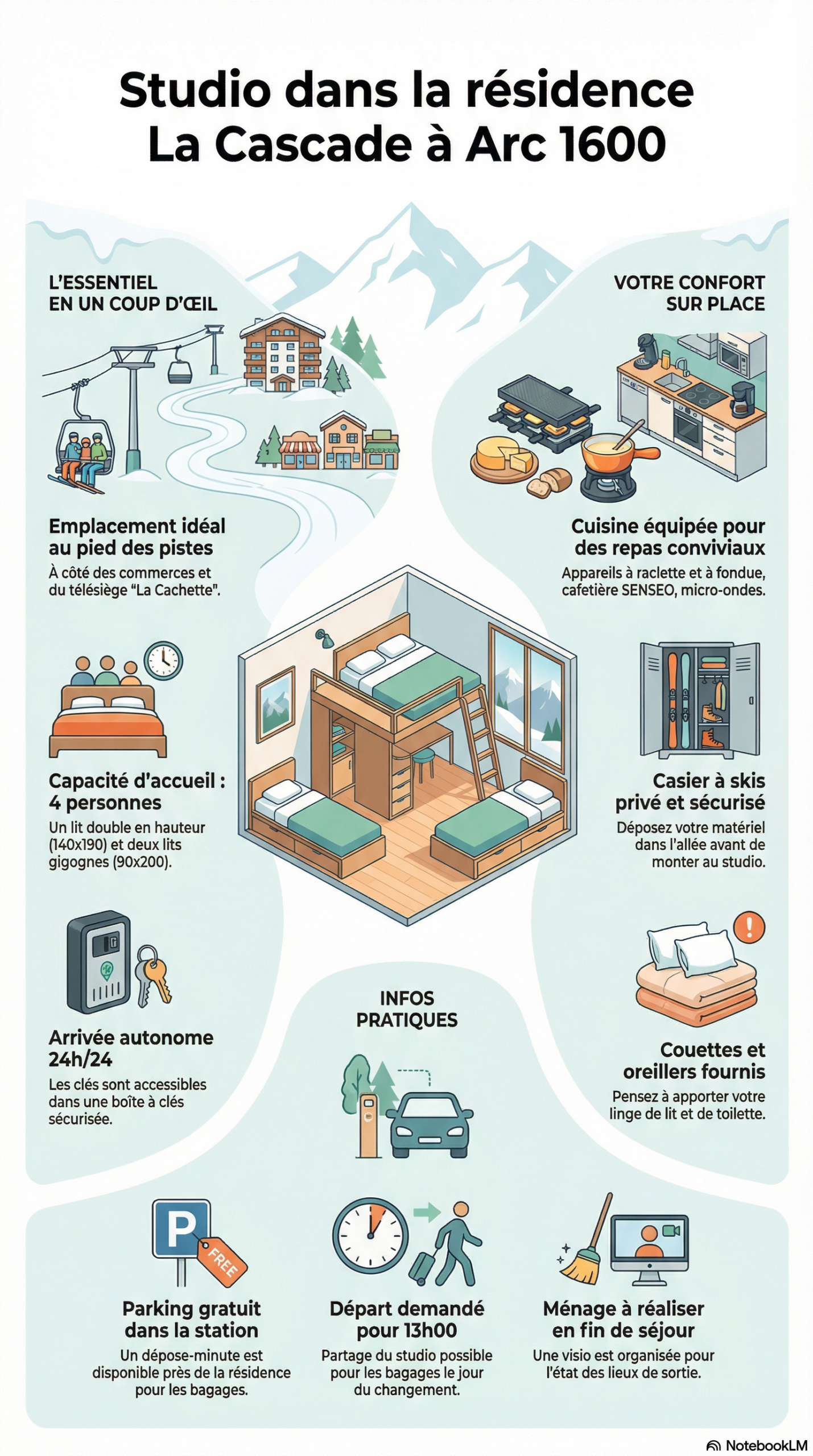 Une semaine avant votre arrivée, vous recevrez par messagerie un lien vers le livret d’accueil qui vous donnera toutes les infos pratiques sur le studio que vous avez loué à Arc 1600.